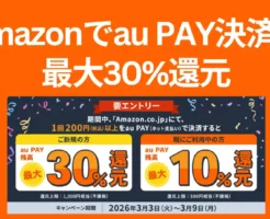 - 【3/9まで】Amazon×au PAYキャンペーン | 初利用30%還元、既利用者も10%還元!)※予算上限に達し次第、終了→早めの利用がベター